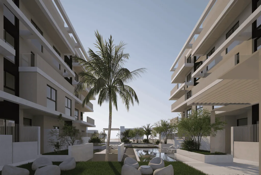 El proyecto se organiza en torno a espacios abiertos y luminosos, con viviendas que priorizan la amplitud visual y la calidad en los materiales. Cada unidad cuenta con terrazas generosas o espacios exteriores privados, concebidos como una prolongación natural del hogar, pensados para disfrutar del aire libre en privacidad y comodidad.
